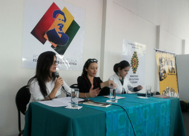 La escritora Lina Meruane (al centro), exponiendo en la XX Feria del Libro de La Paz.