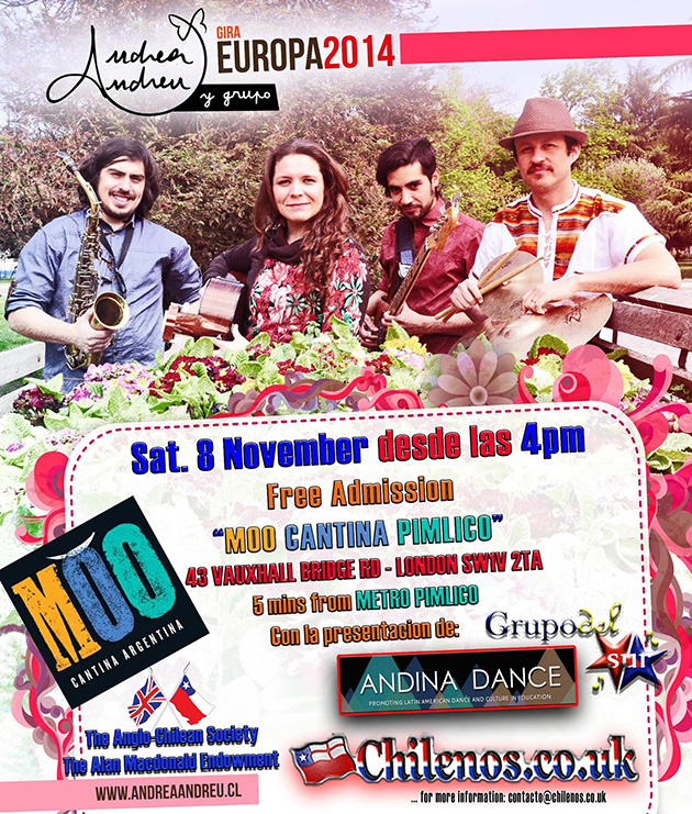 Andrea Andreu & Grupo Gira Europa 2014 Comparte Síguenos A+ A- El sábado 8 de noviembre se presenta Andrea Andreu y Grupo en Moo Cantina Pimilco desde las 4 pm. Entrada Librerada