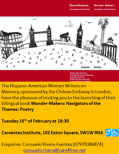 Te invitamos a participar del lanzamiento del libro de poesía Wonder-Makers: Navigators of the Thames by The Hispano-American Women Writers on Memory, el cual se llevará a cabo el día 16 de febrero, a las 6.30pm, en el Instituto Cervantes.