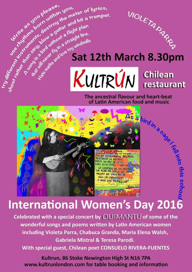 We have a special concert taking place at Kultrún Chilean restaurant on Saturday 12th March to celebrate International Womens Day (8th March). The programme will feature the work of important Chilean women songwriters, composers and poets including Violeta Parra, Chabuca Granda, María Elena Walsh, Gabriela Mistral and Teresa Parodi. Kultrúns resident band the Anglo-Chilean group Quimantu will be joined by the Chilean poet Consuelo Rivera-Fuentes for the occasion.
