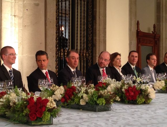 El Ministro de Relaciones Exteriores, Alfredo Moreno, y sus pares de Colombia, María Ángela Holguín, y de Perú, Eda Rivas, fueron recibidos esta tarde en el Palacio de Gobierno de México por el Presidente Enrique Peña Nieto en el contexto del almuerzo de Clausura de la XXV Reunión de Embajadores y Cónsules organizada por la Cancillería mexicana.