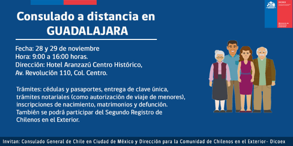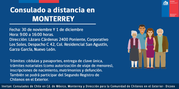 Este 28 de noviembre y 1 de diciembre se realizarán consulados a distancia en Guadalajara y Monterrey, México. Los asistentes podrán realizar trámites como renovar cédula de identidad o pasaporte, inscripciones de nacimiento y matrimonio, entre otros.