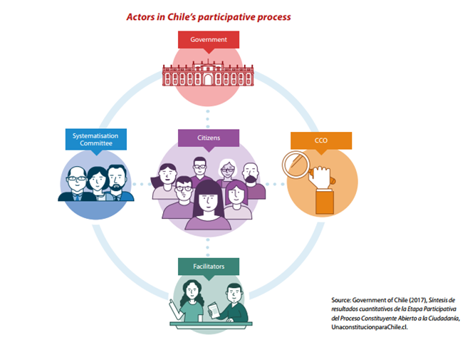 La OCDE examinó el mecanismo utilizado en Chile a partir de sus principios sobre formulación de políticas abiertas e inclusivas en la toma de decisiones y sobre participación de los interesados en la política reguladora. Estos principios sirvieron de marco analítico para evaluar el mecanismo de participación ciudadana en el proceso constituyente en Chile. Según la Organización, el proceso cumplió con el principio de liderazgo y compromiso, dado que todos los niveles de gobierno estuvieron involucrados en la coordinación del proceso. Acerca del principio que recomienda planificar el proceso estratégicamente, también se considera cumplido, no obstante se hacen recomendaciones para futuros procesos similares: dedicar más tiempo a las reuniones locales (ELAs) y asignar más recursos a las campañas de información de modo de alcanzar una audiencia más amplia. También se cumplió con el principio de transparencia, de acuerdo con el cual "la información gubernamental debe ser completa, objetiva, confiable, pertinente y fácil de encontrar y entender". El reporte califica como notable el esfuerzo realizado para hacer disponible la información general, los pasos del proceso y la forma de participar, así como proporcionar material de orientación y tutoriales en video con ejemplos de cada una de las cuatro modalidades de participación. El proceso también cumplió satisfactoriamente con el principio de rendición de cuentas. Sin embargo, se señala que la consulta se hubiera beneficiado de más comentarios y seguimiento en cada etapa. También, se implementó en esta consulta una activa función de vigilancia sobre el proceso con el Concejo Ciudadano de Observadores. Adicionalmente, se logró un buen nivel de inclusión de todos los individuos en el proceso de ELAs, pero se hubiera podido incluir más a las minorías según la OCDE. Finalmente, también se cumplió con la necesidad de incluir a los ciudadanos desde el principio del proceso.