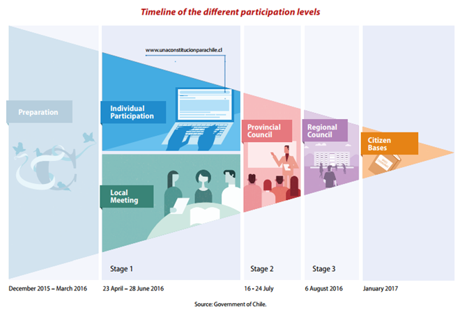 En octubre de 2015, la presidenta Bachelet lanzó el proceso constitucional abierto a los ciudadanos el que debería desarrollarse en tres etapas: