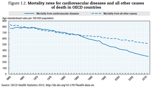 En su reporte Enfermedades Cardiovasculares y Diabetes: Políticas para una mejor salud y calidad de la atención(Cardiovascular Disease and Diabetes: Policies for Better Health and Quality of Care) la OCDE destaca que la tasa de mortalidad debido a enfermedades cardiovasculares (ECV) ha disminuido en un 61% en los últimos 50 años. Si en 1985, esta era la razón tras la mitad de las muertes en los países OCDE, para 2011 la cifra era de un tercio. Sin embargo, las ECV siguen siendo la causa más común de muerte en los países de la OCDE. De ahí la necesidad de fortalecer la capacidad de prevención y el tratamiento de estas enfermedades en los sistemas de salud.