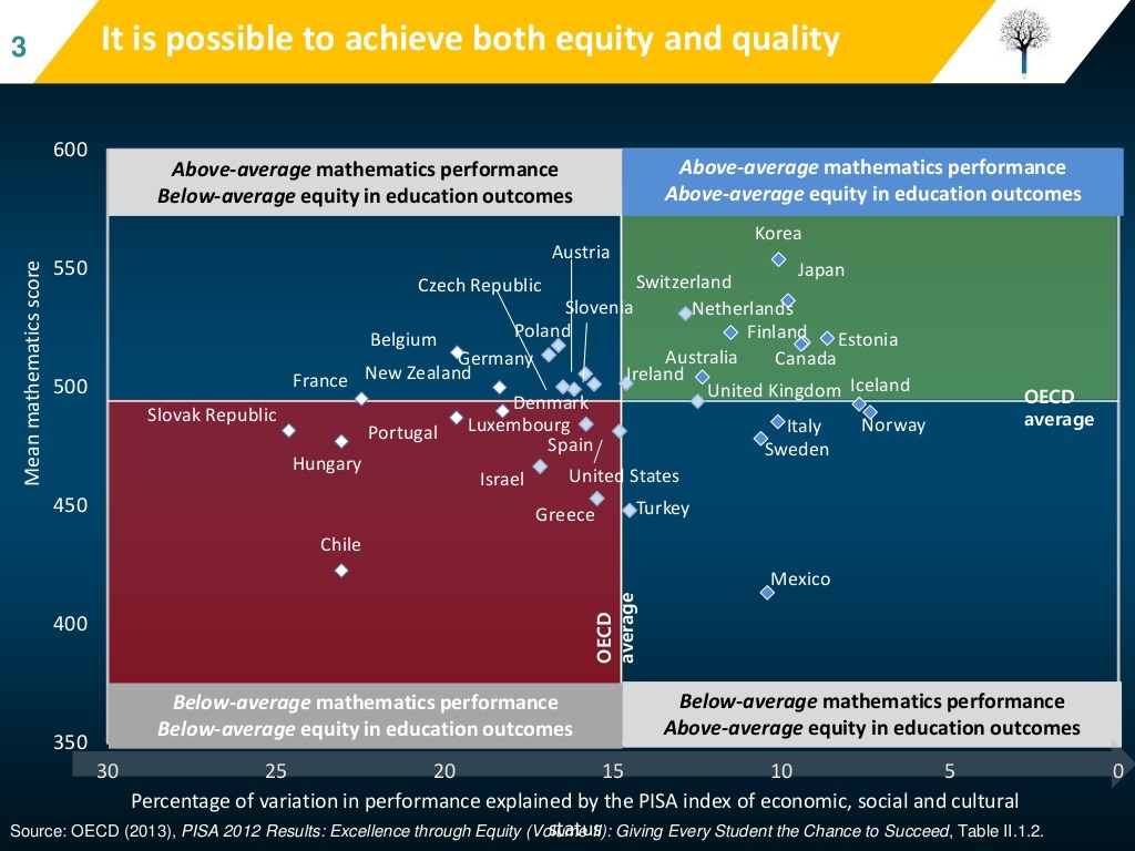 Las principales constataciones del informe son de dos tipos. Primero, sobre la importancia de la comparación sistemática y el intercambio entre países que empuja hacia mejores arreglos institucionales y prácticas educativas para lograr mejores resultados. Destaca el papel que le cabe a la prueba PISA como instrumento que muestra sin apelaciones cuáles son los resultados que obtienen los países. El informe también destaca que los países que mejor lo hacen, están permanentemente atentos a seguir observando sus procesos y resultados, a compararse e introducir mejoras. Asimismo, el informe menciona que los tomadores de decisiones y autoridades políticas deben contar con información y análisis basados en evidencia para impulsar reformas tendientes a instalar sistemas de alto rendimiento educativo y equidad educativa.