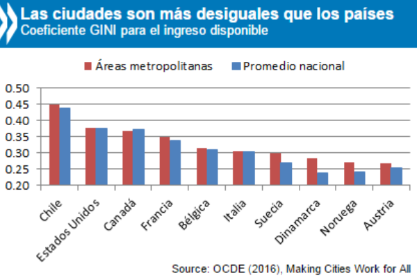 Al estudiar las ciudades de +500.000 habitantes de 10 países OCDE, el informe encuentra que en todos los países, a excepción de Canadá, el promedio de desigualdad en la ciudad es mayor que el nivel medio nacional. Además, las ciudades chilenas son, en promedio, las más desiguales: