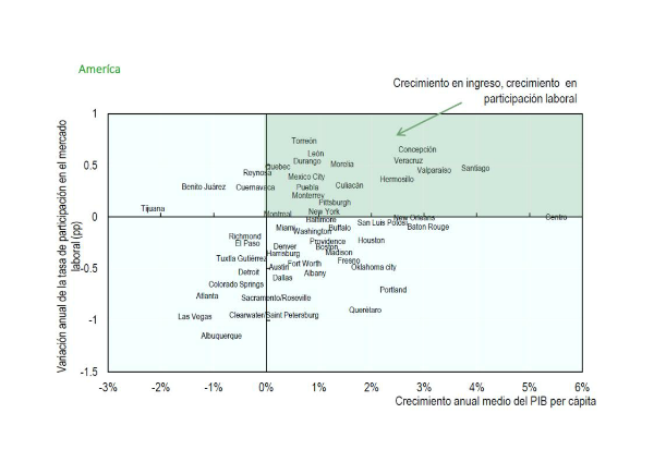 El estudio subraya que no sólo hay que analizar los ingresos para medir el bienestar a nivel local. Una forma en la que el informe mide el crecimiento inclusivo es mirando si las ciudades al crecer económicamente, involucraron un mayor número de sus habitantes en este proceso. Los resultados difieren mucho entre ciudades; mientras algunas, como Santiago o Valparaíso, han incrementado tanto su PIB como su participación laboral, en otras, como Querétaro (México), el crecimiento aumentó mientras la participación en el mercado laboral disminuía. En otras, tanto el PIB como la participación se han estancado o disminuido.