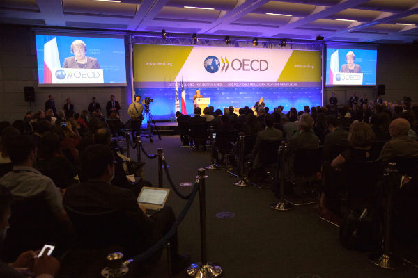 En el marco de su visita oficial a Francia, la Presidenta Michelle Bachelet sostuvo un encuentro bilateral con el Secretario General de la Organización para la Cooperación y el Desarrollo Económicos (OCDE), el mexicano Angel Gurría, y luego realizó una presentación ante el personal de la Organización y las delegaciones permanentes de los países miembros.