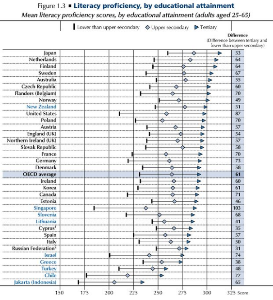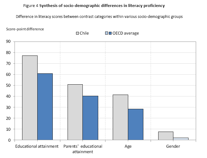 En el siguiente gráfico 1 observamos el ránking en comprensión lectora de los países evaluados. Los resultados revelan un bajo nivel de competencias en Chile en relación al resto de los países evaluados. Del mismo modo, el estudio muestra que mientras más alto es el nivel educacional entre los adultos, mayores son las competencias en comprensión lectora. Además, la diferencia de resultados en comprensión lectora entre los adultos chilenos que tienen un bajo nivel educacional y los que alcanzan estudios superiores, es uno de los más grandes con respecto a los otros países evaluados (sólo Singapur y Estados Unidos muestran un mayor nivel de diferencia). Las mediciones en matemáticas y resolución de problemas en ambientes tecnológicos muestran un panorama similar.