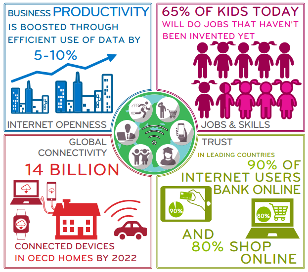 Entre los compromisos de la Declaración están: traer el acceso a todos de la conectividad de banda ancha de mayor velocidad y las tecnologías y servicios digitales; asegurar que las personas tengan un set de conocimientos adecuados para su participación inclusiva en la economía digital; permitir nuevas formas de trabajo habilitados por las tecnologías digitales al tiempo que garantiza la calidad del empleo; desarrollar estrategias de privacidad y protección de datos al más alto nivel de gobierno; analizar la digitalización de la economía y de la sociedad desde una perspectiva global del conjunto del gobierno; y abordar el déficit de datos digitales con el fin de proporcionar mejor evidencia para informar la formulación de políticas como progresos de la digitalización.