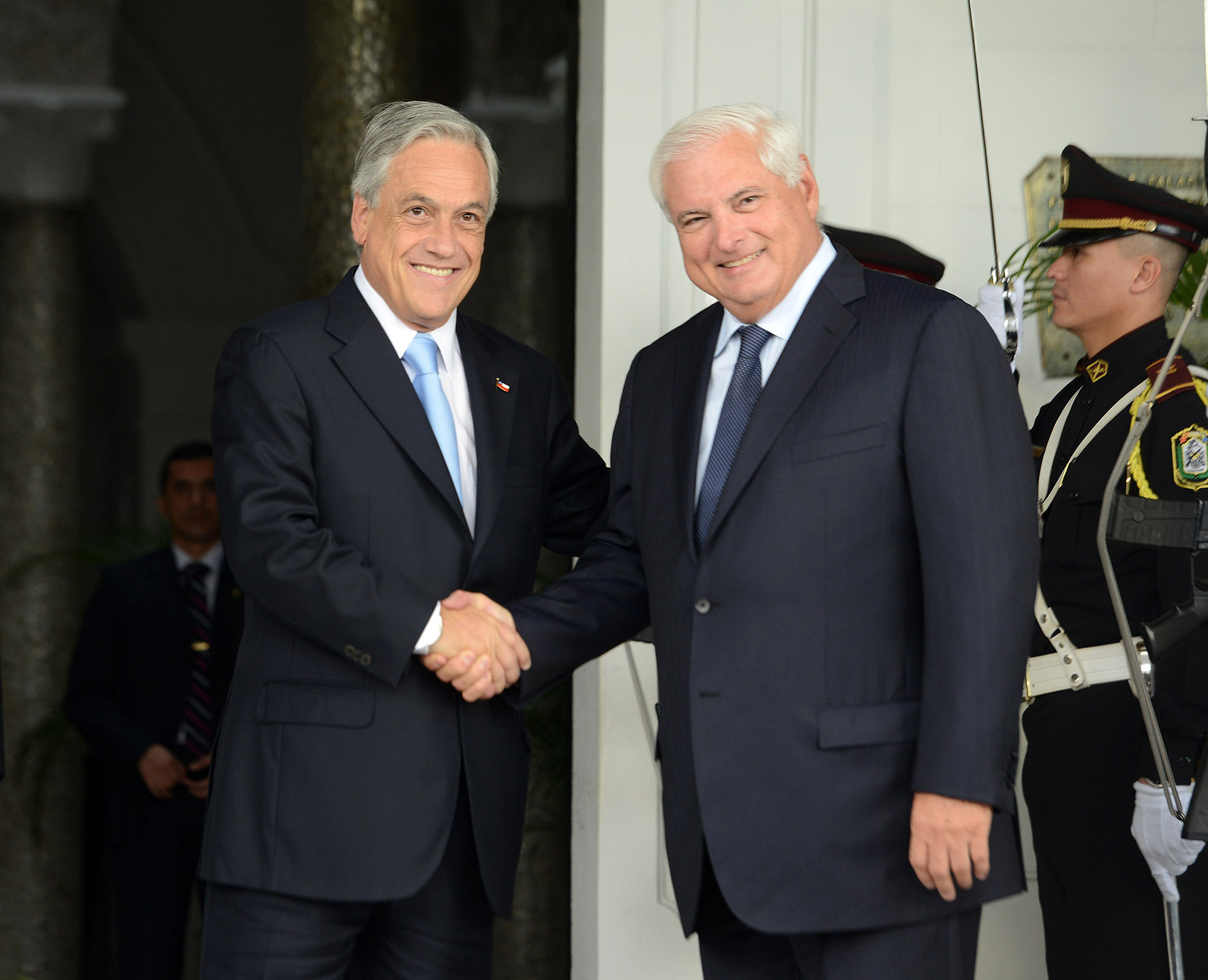 El Presidente de la República, Sebastián Piñera, recibió la bienvenida del Mandatario de Panamá, Ricardo Martinelli, y los honores de la Guardia de Palacio.