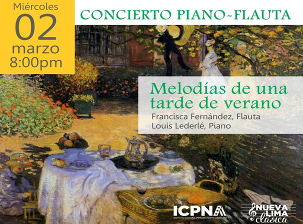 Con gran afluencia de público el Instituto Cultural Peruano Norteamericano (ICPNA) presentó a la Flautista Chilena Francisca Fernández, acompañada en el piano por Louis Lederlé. En la ocasión interpretaron melodías W.A. Mozart, H. Dutilleux, A. Piazzolla, F.Schubert, F. Poulenc.