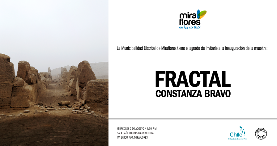 En el Centro Cultural Ricardo Palma del distrito de Miraflores, Lima Perú, expone con el auspicio de la embajada de Chile en el Perú, la Fotógrafa Constanza Bravo. El trabajo de Constanza, llamado Fractal recoge con su lente como la trama urbana de Lima está poblada por vestigios de la cultura prehispánica y como esta convive casi sin reconocimiento en medio de la pobreza. Este trabajo lo desarrollo en el trascurso de los años 2014 -2016. Esta exposición ha sido acogida por el distrito de Miraflores, reconociendo la mirada de una artista chilena respecto a la ciudad de Lima.