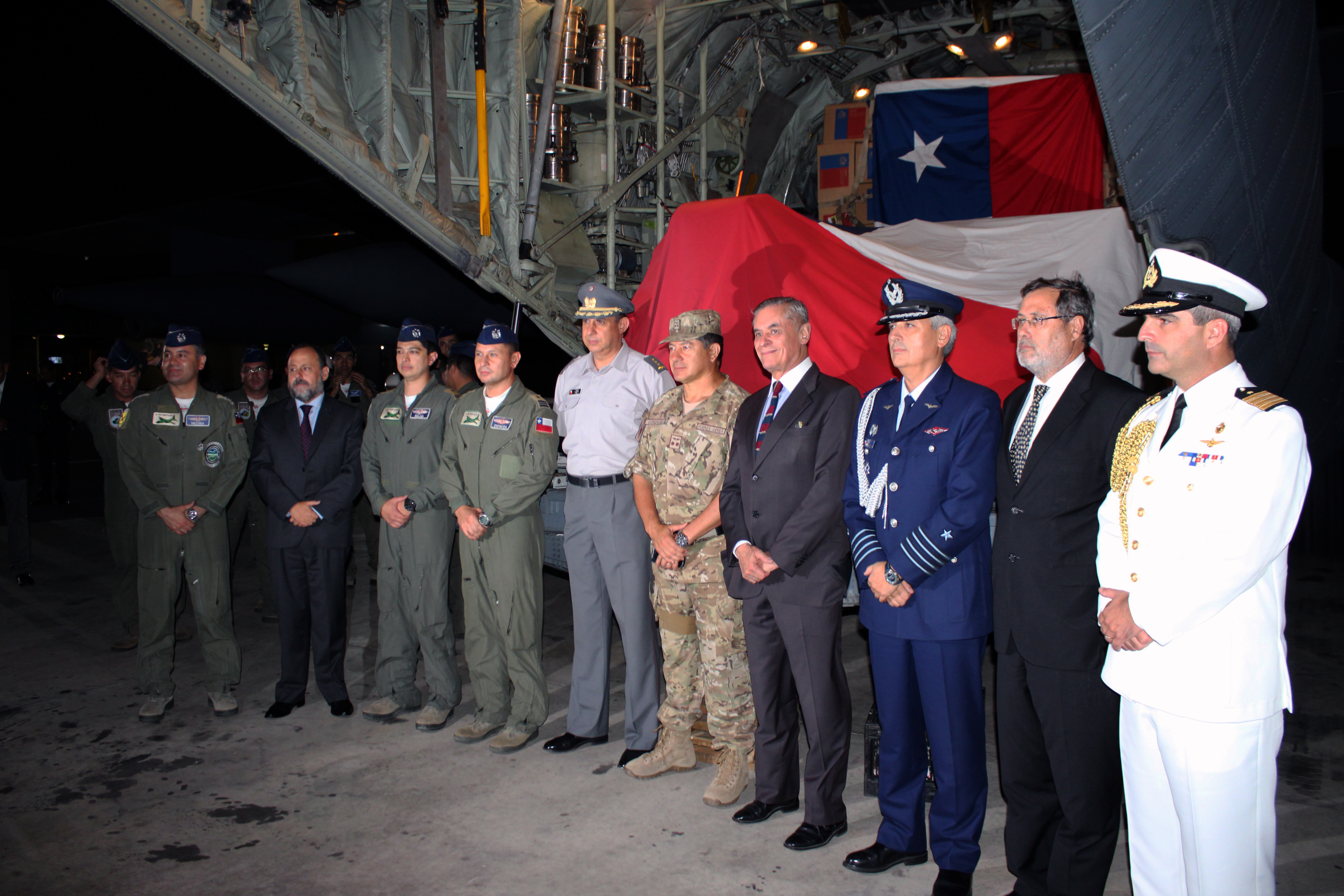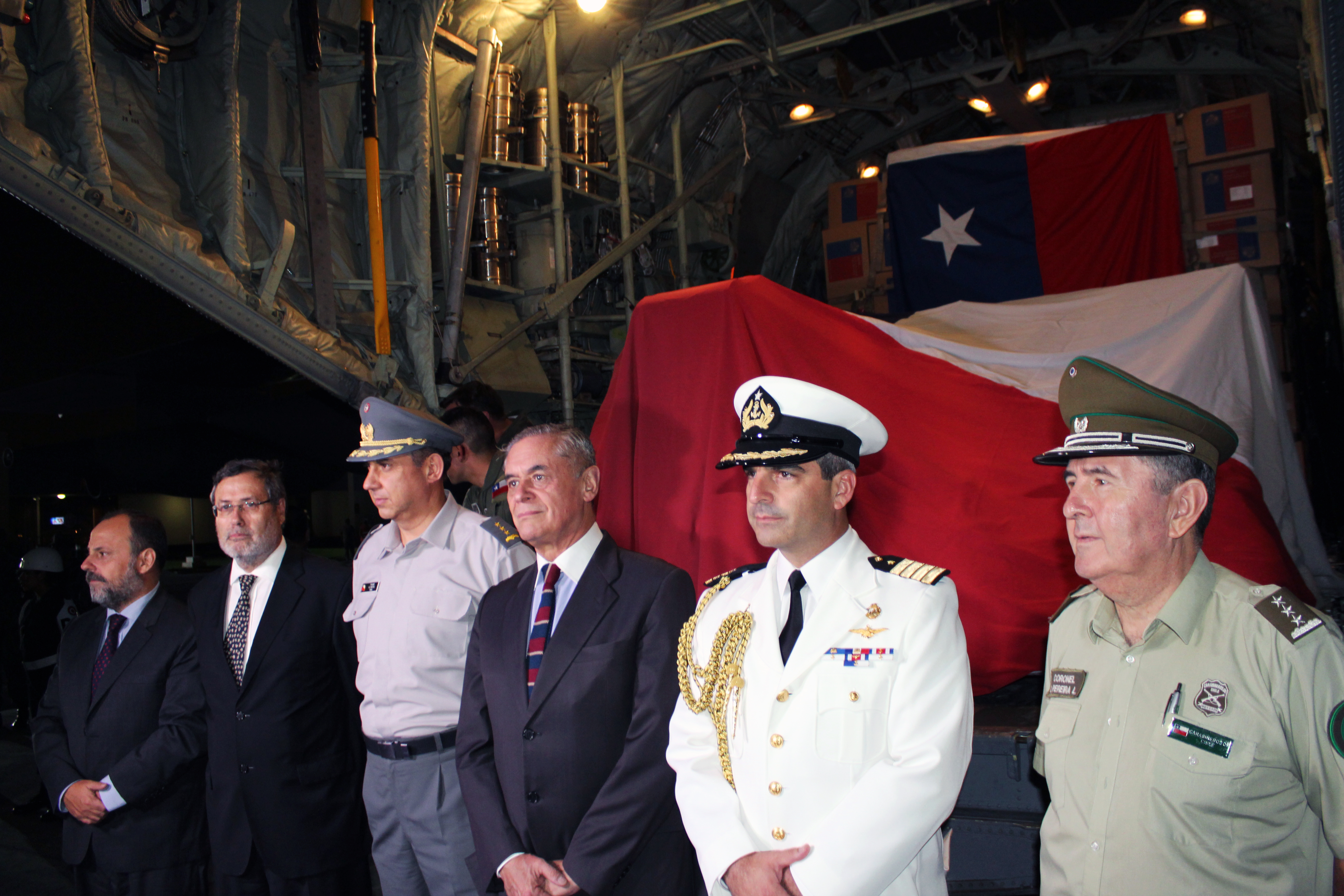 La ayuda fue recibida en el Grupo 10 de la Fuerza Aérea Peruana por el Embajador de Chile en Perú, Roberto Ibarra y el Ministro de Relaciones Exteriores de Perú, Ricardo Luna. Estuvieron presentes además altas autoridades peruanas como el Comandante General de la FAP, General Dante Arévalo Abate y la plana mayor del INDECI.