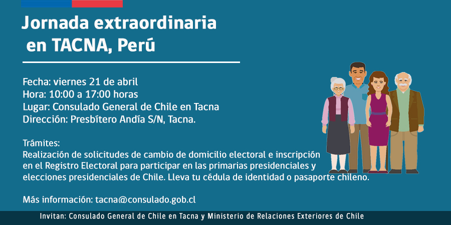 El Consulado General de Chile en Tacna abrirá sus puertas en una jornada extraordinaria el viernes 21 de abril, de 10:00 a 17:00 horas.