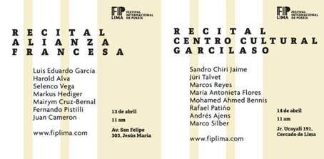 Los poetas chilenos Juan Cameron y Andres Ajens representaron al país en el reciente Festival Internacional de Poesía de Lima FIPLIMA que reunió en un evento único en el Perú a las voces más destacadas de las letras del mundo. Más de 100 reconocidos poetas leyeron sus poemas en una veintena de escenarios de la ciudad de ingreso gratuito para todos los públicos.