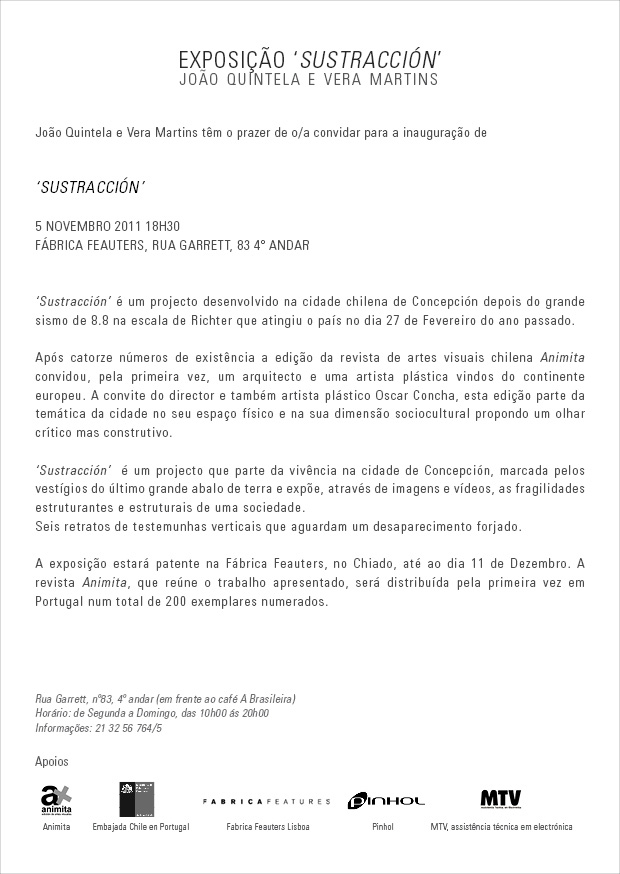 Exposición "Sustracción" de João Quintela e Vera Martins Comparte Síguenos A+ A- Inauguración de la exposición "Sustracción de João Quintela e Vera Martins - SÁBADO 5 DE noviembre a las 18:30 h. en la Fábrica Features, Chiado, Rua Garret 83, 4º piso (entrada por la tienda Benetton).