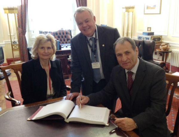 Embajador Drago con el Speaker de la Asamblea Legislativa de Irlanda del Norte, Sr. Mitchell McLaughlin, y la próxima Cónsul honoraria de Chile en Belfast, Lady Mary Ballyedmond