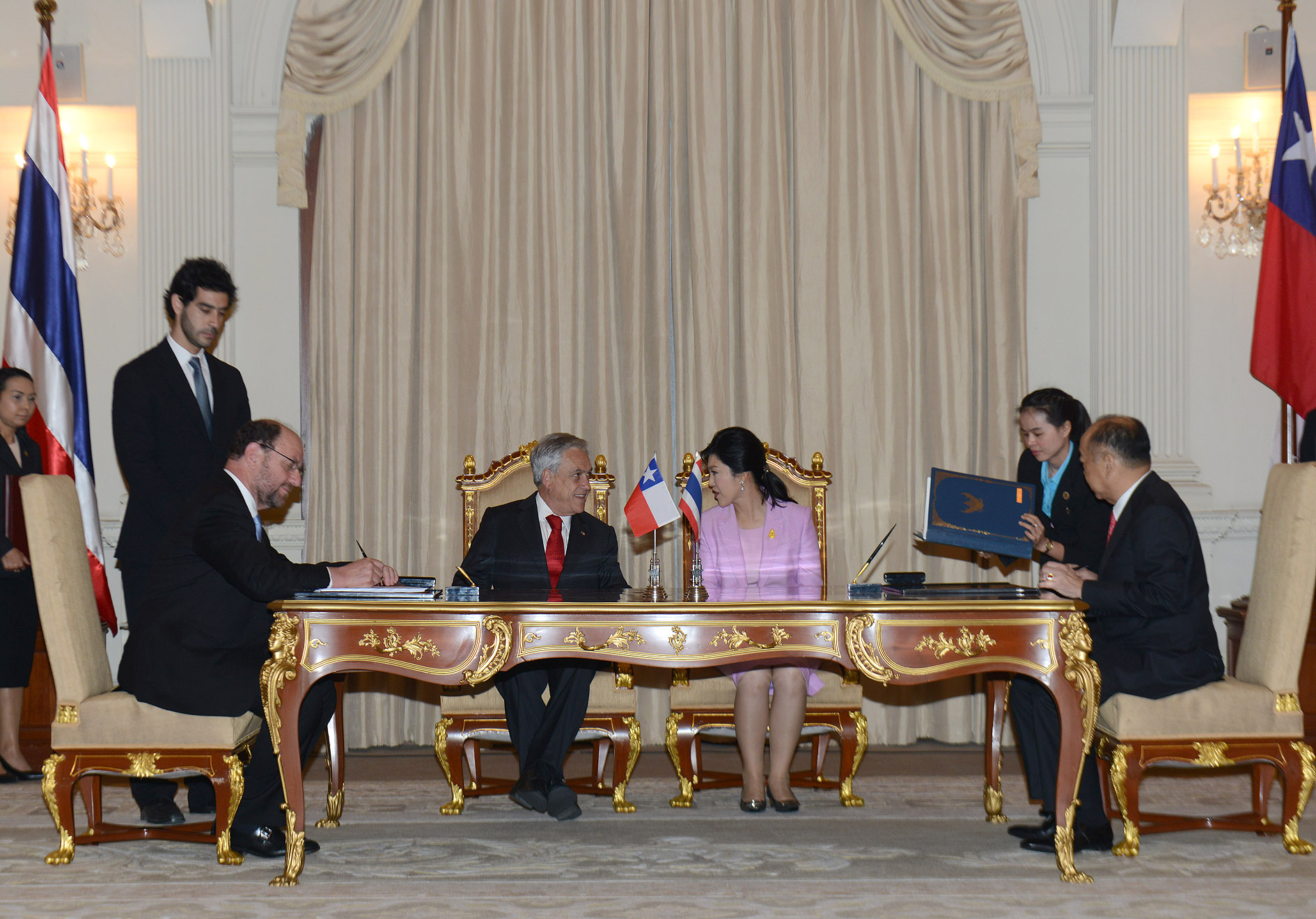 El Presidente de la República, Sebastián Piñera, junto a la Primera Ministra tailandesa, Yingluck Shinawatra, encabezaron hoy en Bangkok, la ceremonia de firma del Tratado de Libre Comercio entre Chile y Tailandia, cuyas negociaciones culminaron exitosamente en agosto de 2012 y permitirán el acceso preferencial inmediato a más del 90% de los productos nacionales.