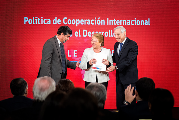 El Ministro de Relaciones Exteriores, Heraldo Muñoz, acompañado del Director de la Agencia Chilena de Cooperación Internacional para el Desarrollo (AGCID), Ricardo Herrera, entregó hoy a la Presidenta Michelle Bachelet, en el Salón Montt-Varas del Palacio de La Moneda, la primera Política y Estrategia de Cooperación Internacional de Chile para el Desarrollo "Chile Coopera", documento que establece una línea de base para proyectar la política de cooperación y contribuir al cumplimiento de los desafíos de la Agenda de Desarrollo de 2030.