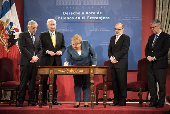 El 30 de abril de 2015, la Presidenta promulgó la Reforma Constitucional que regula el ejercicio del sufragio de ciudadanos que residen fuera del país en las elecciones presidenciales, plebiscitos y primarias presidenciales. El proyecto firmado hoy establecerá el procedimiento para materializar la inscripción en el registro electoral y regulará la manera en que se realizarán los procesos electorales y plebiscitarios.