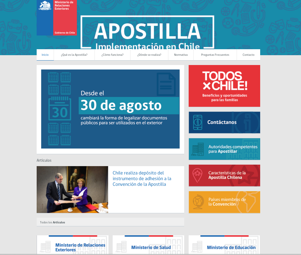 La web incluye información sobre qué es la Apostilla y cómo funciona; dónde se realiza el trámite y las autoridades competentes para apostillar; la normativa en que se enmarca, así como características de la Apostilla chilena y los países miembros de la Convención. Además contiene una sección con preguntas frecuentes y un formulario de contacto.
