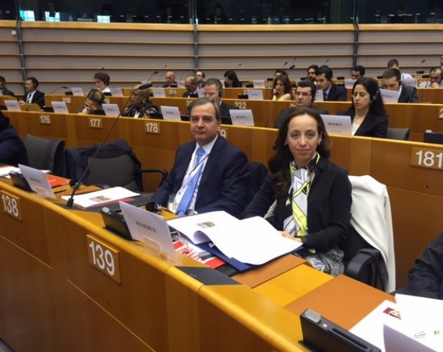 La Embajadora Mariana Durney acompañada por el Embajador Raúl Fernández en la ceremonia inaugural celebrada en el hemiciclo del Parlamento Europeo