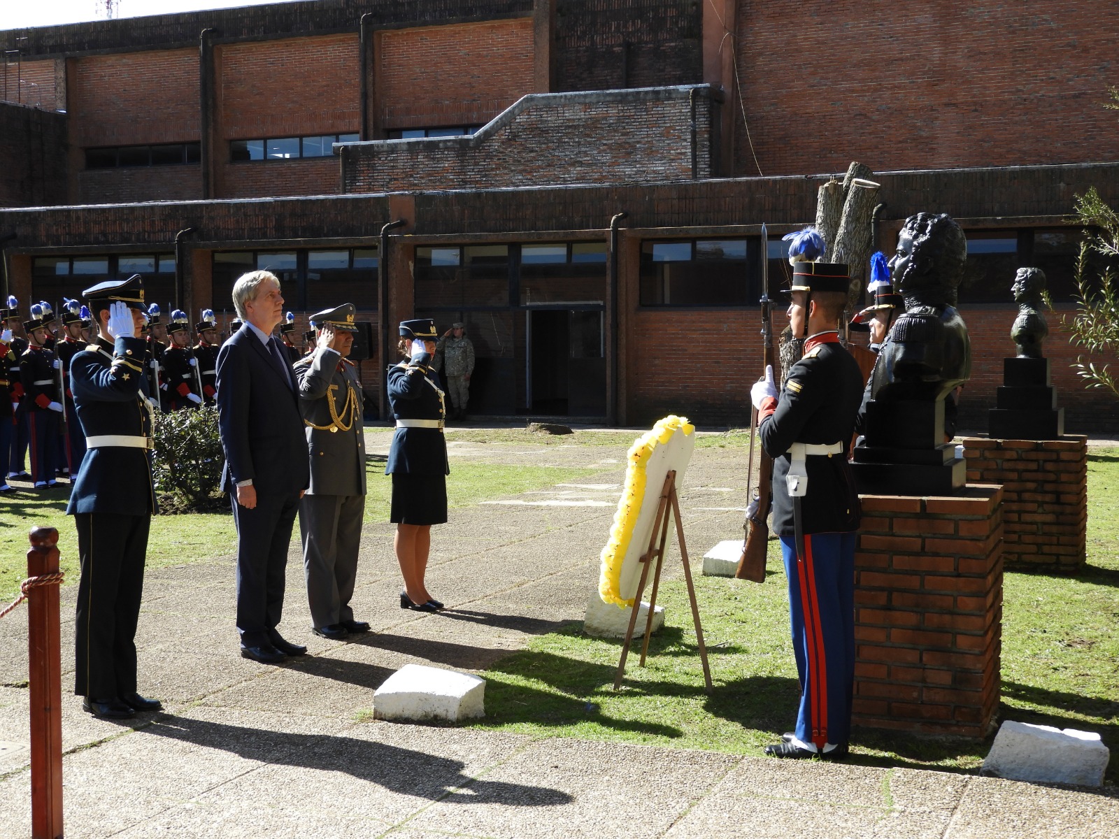 Se interpretaron los himnos nacionales de ambos países y se puso una ofrenda floral en el busto del prócer ubicado en el patio principal de dicha Escuela, por el Encargado de Negocios de Chile, Eugenio del Solar, el Agregado de Defensa de Chile, Coronel Carlo Garbarini y dos cadetes de la Escuela Militar de nuestro país.