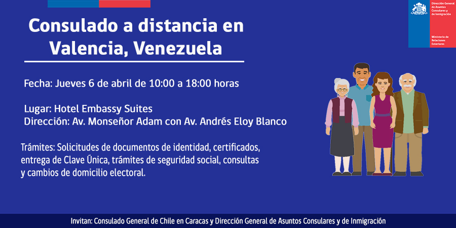 Con el propósito de atender a los chilenos residentes en distintos lugares de Venezuela, el 6 de abril el Consulado de Chile en Caracas, realizará una jornada de servicios consulares en Valencia.