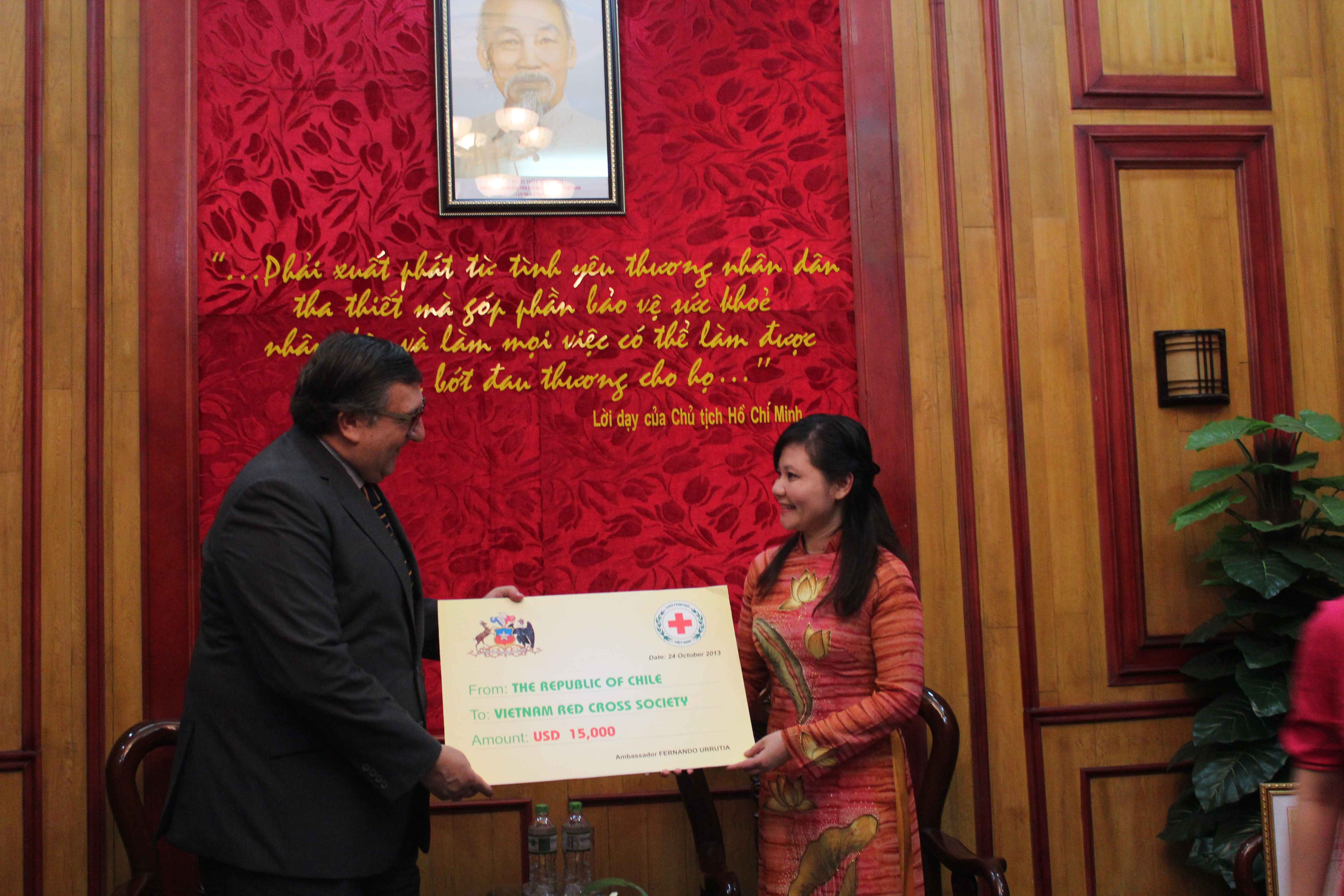 El Embajador de Chile en Vietnam, Fernando Urrutia, en nombre del Gobierno de Chile entregó una donación de US$ 15.000 como aporte humanitario para ayudar a los damnificados por el Tifón Wutip que afectó en el mes de septiembre a diversas provincias de la zona central de Vietnam. La ceremonia se realizó en la sede de la Cruz Roja.