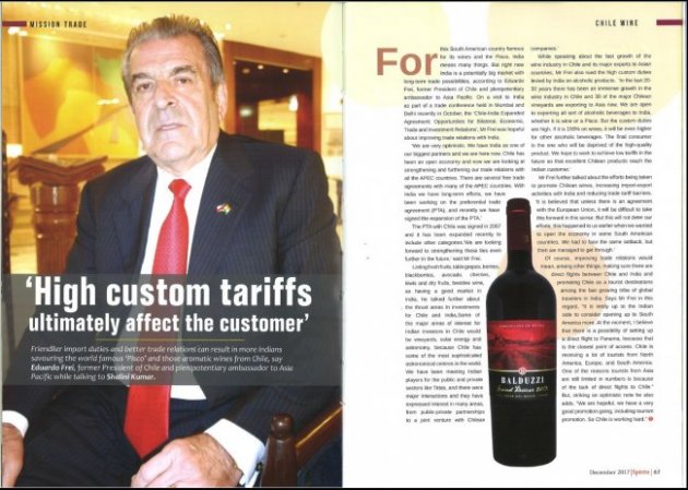 Reportajes visita de Ex Presidente y Embajador en Misión Especial para Asia Pacífico, señor Eduardo Frei, y sobre pisco chileno en Revista Spiritz