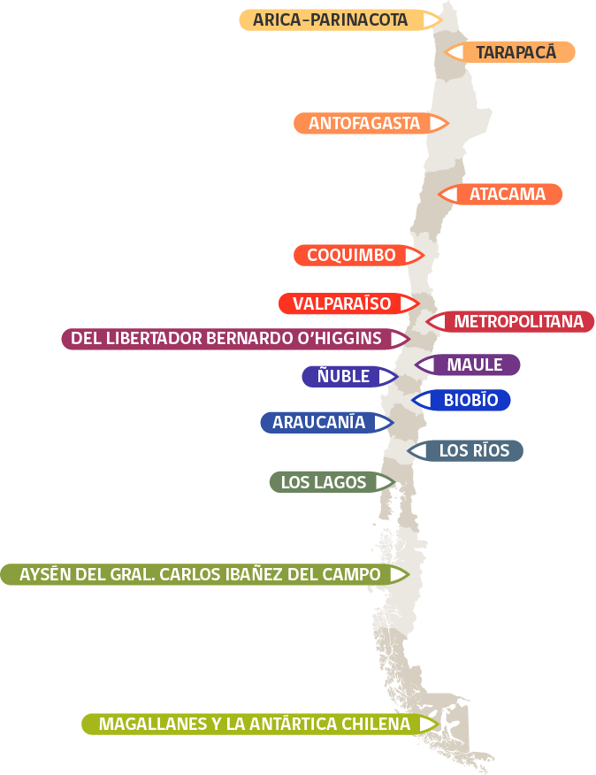 En términos administrativos, Chile se divide en 16 regiones, que son, de norte a sur: