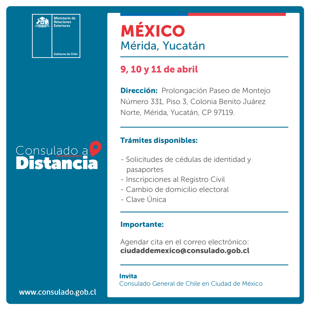 El Consulado General de Chile en Ciudad de México se trasladará hasta Mérida, Yucatán, para atender a chilenas y chilenos residentes en la actividad "Consulado a distancia".
