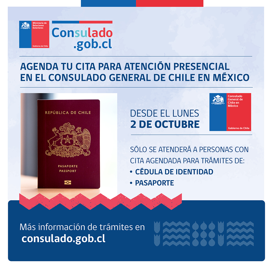 Si vives en Ciudad de México y necesitas obtener o renovar tu cédula de identidad y pasaporte, desde el lunes 2 de octubre 2023, en el Consulado General de Chile en Ciudad de México, sólo se dispondrá de atención para personas que agendaron cita en el sitio web.