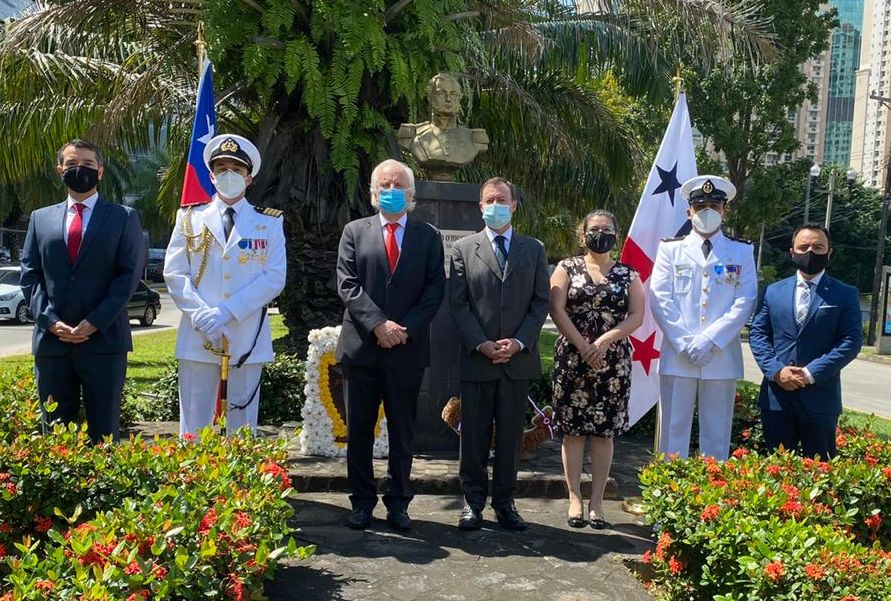 El Embajador de Chile en Panamá, Germán Becker, encabezó una ofrenda floral al busto del Libertador General Bernardo O'Higgins en Ciudad de Panamá, con motivo del 210° aniversario patrio y las Fiestas Patrias.