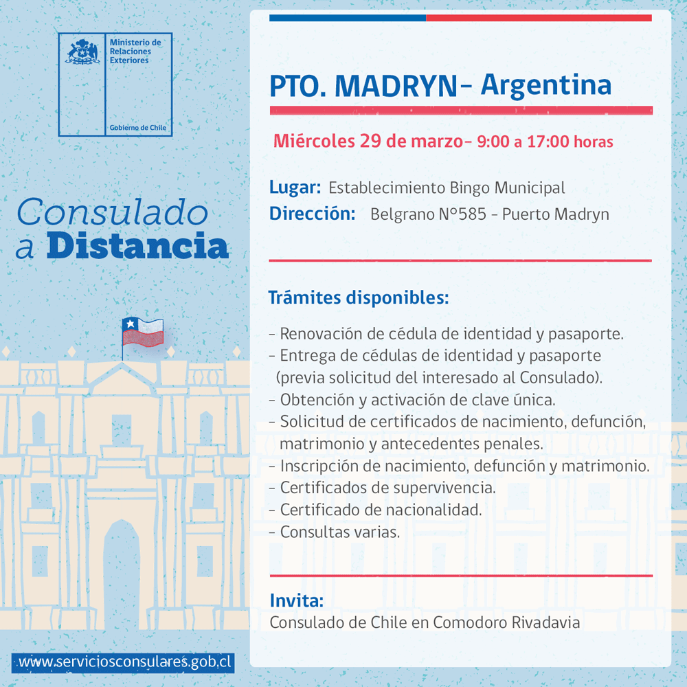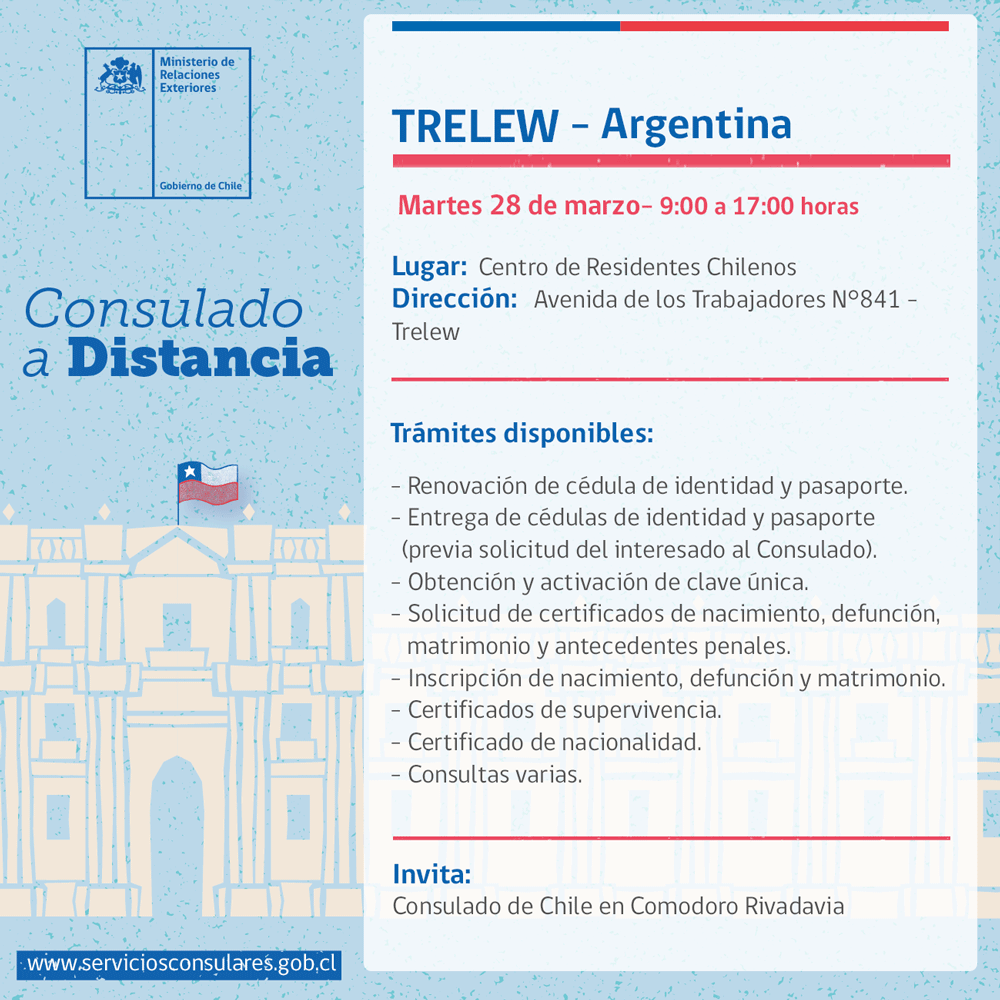 El próximo 28 y 29 de marzo, el Consulado de Chile en Comodoro Rivadavia realizará un consulado a distancia en las ciudades de Trelew y Puerto Madryn respectivamente.