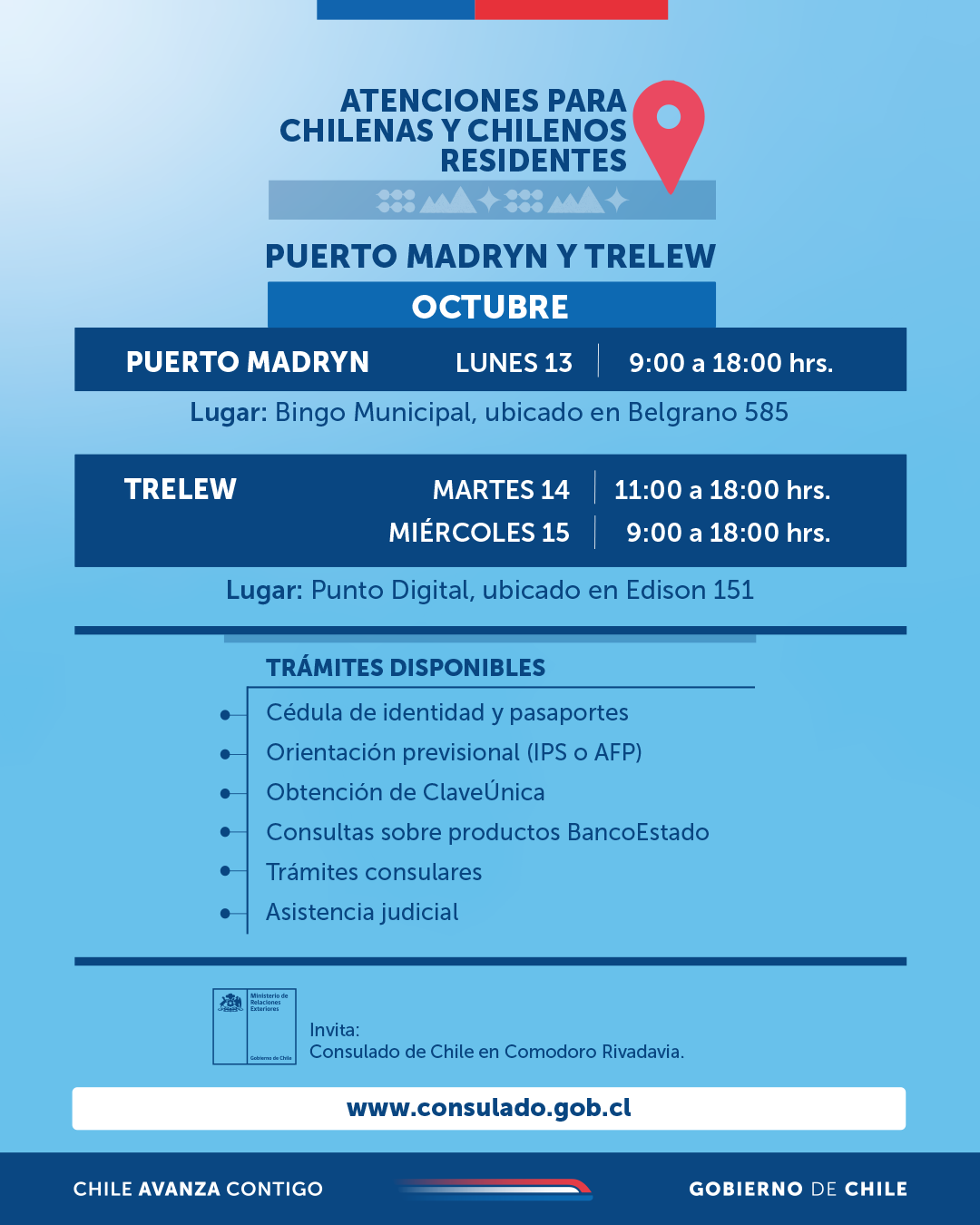 DICOEX y el Consulado de Chile en Comodoro Rivadavia invita a todas las chilenas y chilenos residentes en Puerto Madryn y Trelew a participar en las jornadas de atención consular y servicios públicos chilenos, que se realizarán durante el mes de octubre.