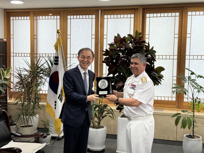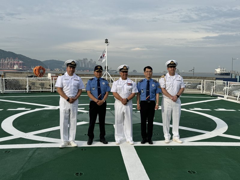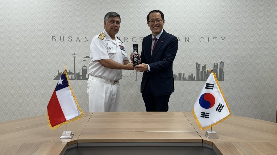 El director del Territorio Marítimo y Marina Mercante Nacional - Directemar, vicealmirante Fernando Cabrera, visitó Corea entre el 15 y 21 de junio, para participar en la Korea Ocean Expo, en Songdo. El vicealmirante Cabrera estuvo acompañado por el subjefe del Departamento de Asuntos Internacionales de Directemar, Capitán de Fragata (R) Enrique Vargas, y por funcionarios de la Embajada de Chile en Seúl, incluyendo el agregado de Defensa Capitán de Navío Rodrigo Pérez.