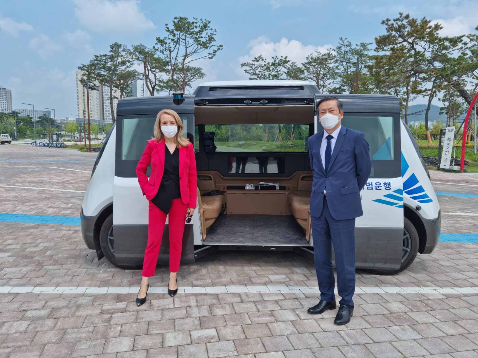 Además, la Embajadora tuvo la oportunidad de realizar un recorrido en uno de los vehículos autónomos que se está desarrollando en la ciudad con tecnología coreana, y visitar el Sejong Smart City Center, centro de operaciones donde se analizan temas como uso de energías renovables, gestión del riesgo de desastres socioambientales, seguridad ciudadana, tráfico urbano, infraestructura, salud y educación, a partir del uso de tecnologías.