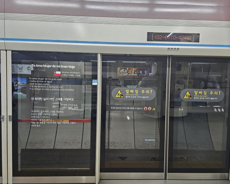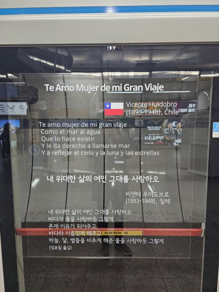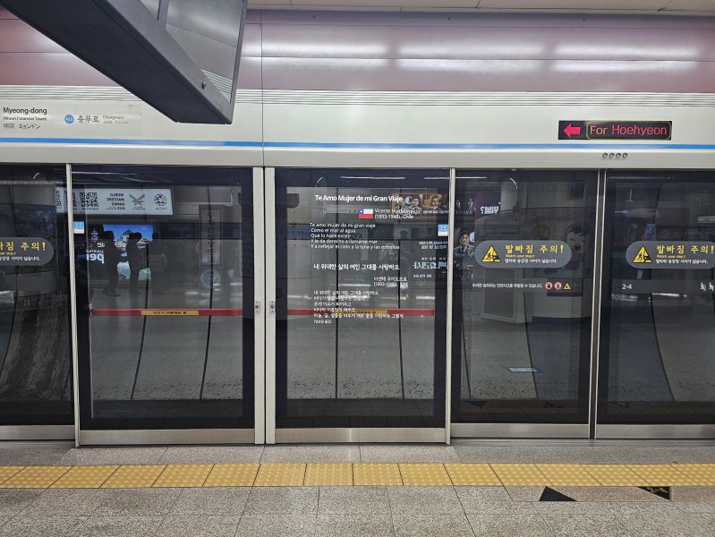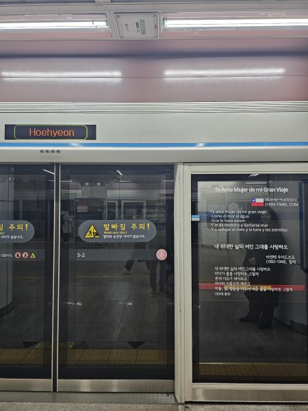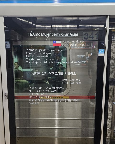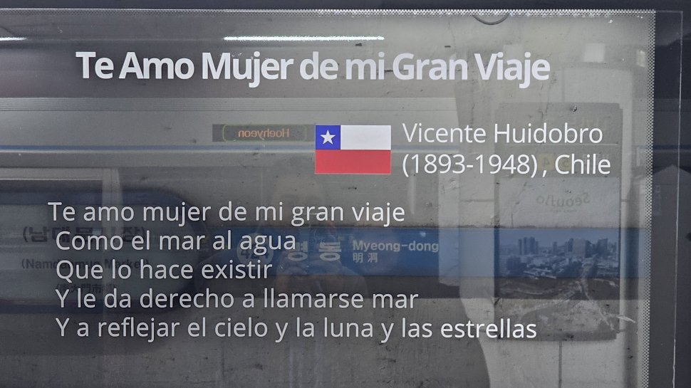 Desde este mes, el poema "Te Amo Mujer de mi Gran Viaje" de Vicente Huidobro, traducido al coreano y español, se exhibe en las estaciones Myeongdong y Hoehyun de la Línea 4 del Metro de Seúl. Este queda en una zona clave, de las más concurridas y turísticas de la ciudad y permanecerá por un periodo de dos años.