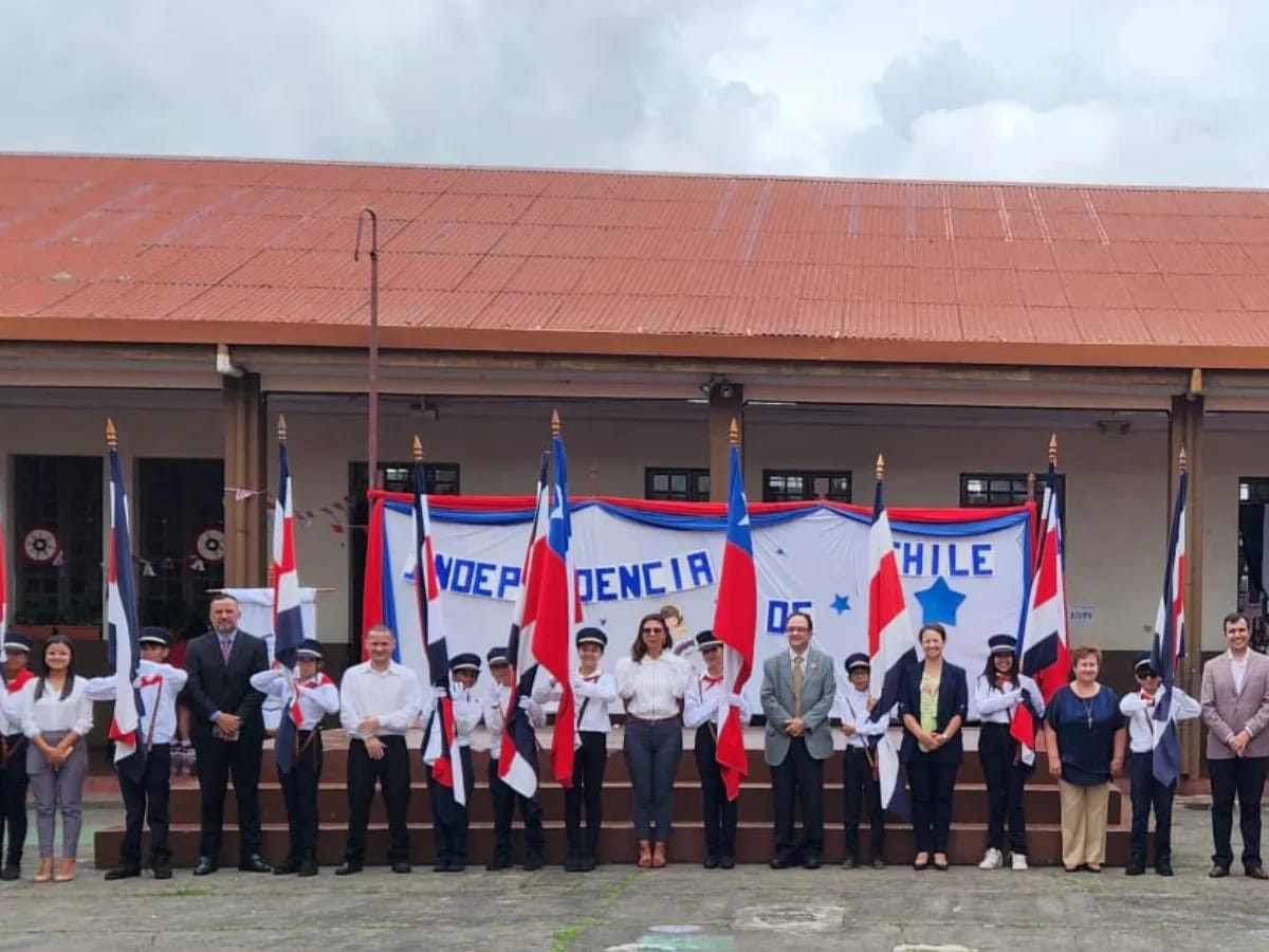 La embajadora Margarita Portuguez, acompañada del jefe de Cancillería Álvaro Guzmán y la cónsul Carla Molina, participaron de una emotiva celebración de fiestas patrias organizada por la Escuela República de Chile, ubicada en el barrio Luján, en San José, muy cerca de nuestra embajada.