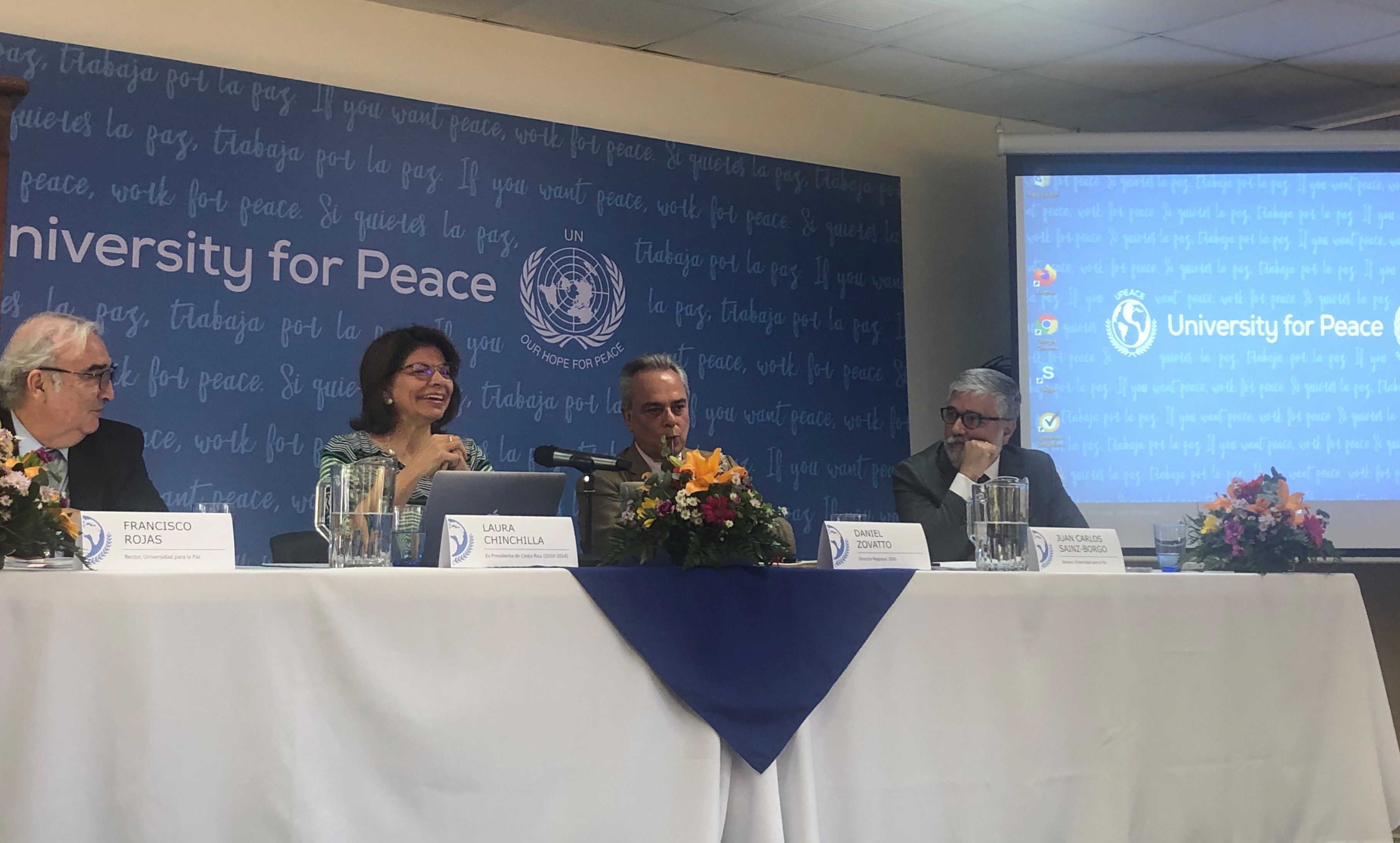 De izq. a der.: Rector Francisco Rojas; expresidenta de Costa Rica, Laura Chinchilla; Director Regional IDEA, Daniel Zovatto; y Mario Carazo, presidente del Consejo UPAZ.