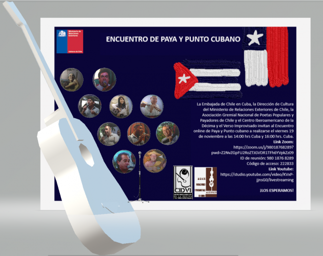 La Embajada de Chile en Cuba y la Dirección de Asuntos Culturales del Ministerio de Relaciones Exteriores de Chile, en conjunto con la Asociación Gremial Nacional de Poetas Populares y Payadores de Chile, el Centro Iberoamericano de la Décima y el Verso Improvisado de La Habana, realizarán de modo virtual el viernes 19 de noviembre a las 14:00 hrs. local (16:00 hrs. de Chile), el "Encuentro de Paya y Punto cubano".