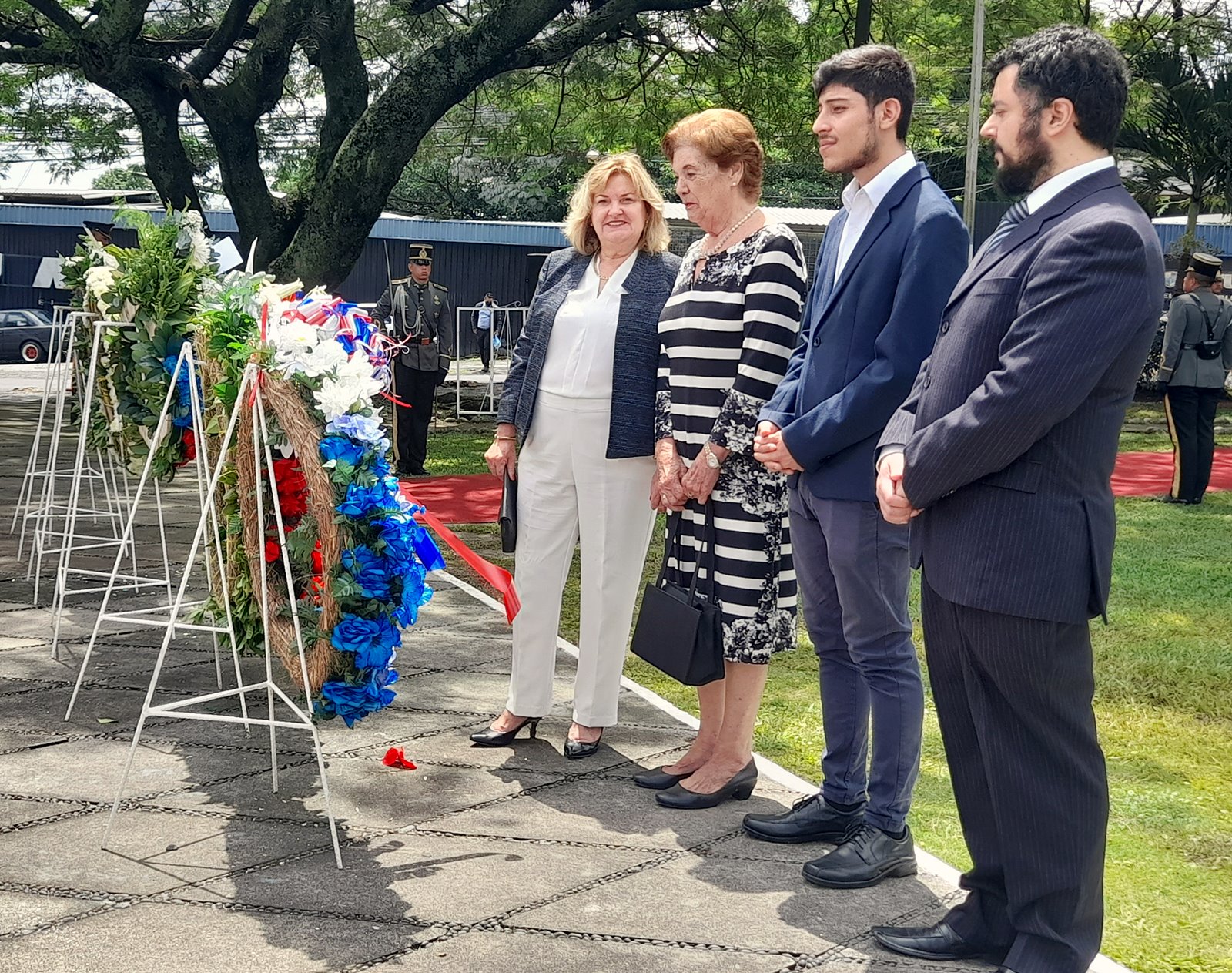 Miembros de la colonia chilena residente en El Salvador colocaron una ofrenda floral en Plaza Chile