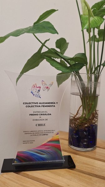 La embajada de Chile se honra en recibir un reconocimiento de parte de Colectivo Alejandría y Colectiva Feminista por los aportes a la lucha y defensa de los Derechos Humanos de la población LGBTIQ+ en El Salvador.