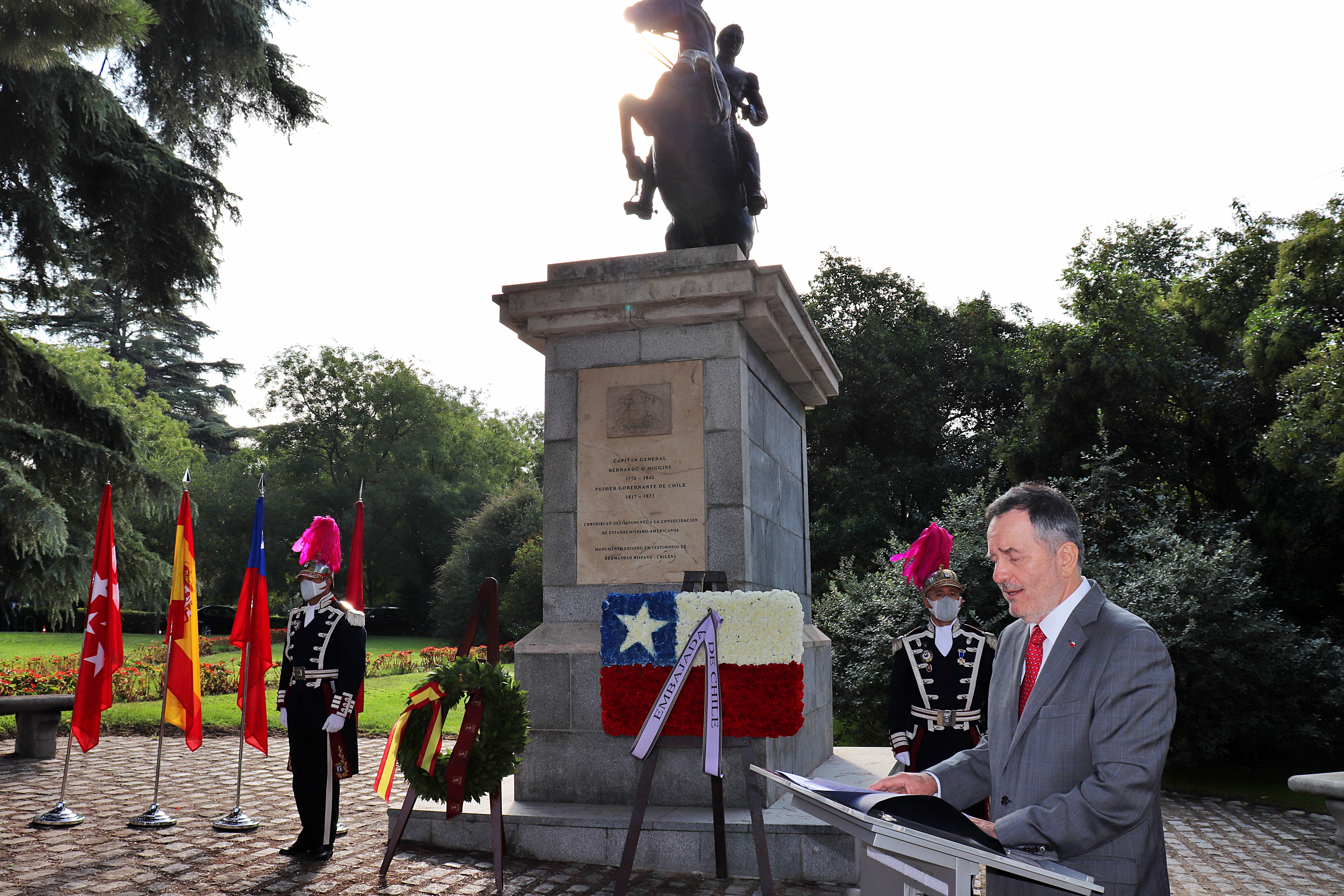 Hablando durante una ceremonia celebrada a los pies del monumento a Bernardo O'Higgins, en el sector Parque de la Bombilla, en Madrid, el Jefe de la Misión, hizo ver que "O'Higgins fue un hombre con ideas de futuro, de armas, de letras y que intuyó tempranamente cuál era el camino que debía seguir el país, decidiendo en favor de Chile, de las circunstancias en el campo de batalla, avizorando y marcando un destino que es, al final, el que nos ha conducido a ser también el país que es hoy".