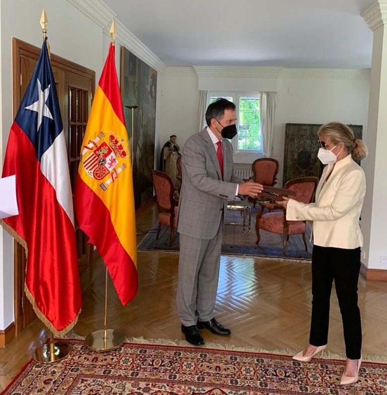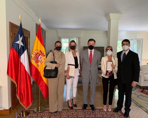 Durante la ceremonia, que se realizó en la Residencia Oficial de la Embajada de Chile, el Jefe de la Misión, hizo entrega de la condecoración a título póstumo, “Orden de Bernardo O’Higgins en el grado de Gran Oficial”, a la viuda, Carmen Machado Alique, quien estuvo acompañada de sus hijos Sandra, Paola y Pedro García Sanjuán.