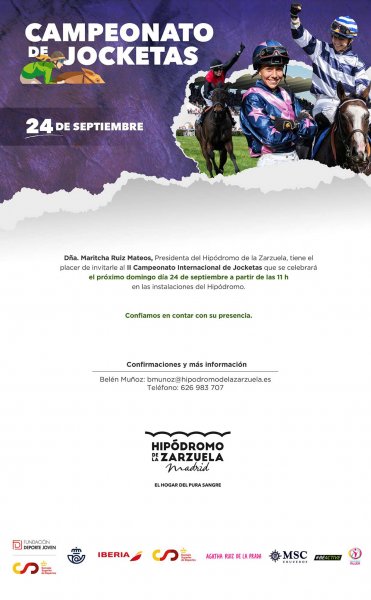 El domingo 24 de septiembre de 2023, la Embajada de Chile ante el Reino de España, acompañó a la “jocketa” chilena Lesly Carolina González, quien compitió entre otras 11 jinetes provenientes de República Checa, Inglaterra, Brasil, Estados Unidos, España, Alemania y Francia, en el “II Campeonato Internacional de Jocketas” que tuvo lugar en el “Hipódromo de la Zarzuela Madrid: El Hogar del Pura Sangre”.