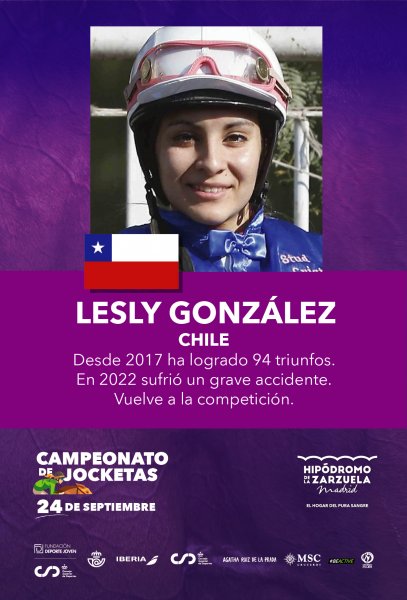 Lesly González es una jinete que se inició cuidando caballos en Chile a los 16 años. En 2017 logró la licencia de amazona y a la fecha ha logrado 94 triunfos. En 2022 sufrió un grave accidente, volviendo a las pistas en fecha reciente.